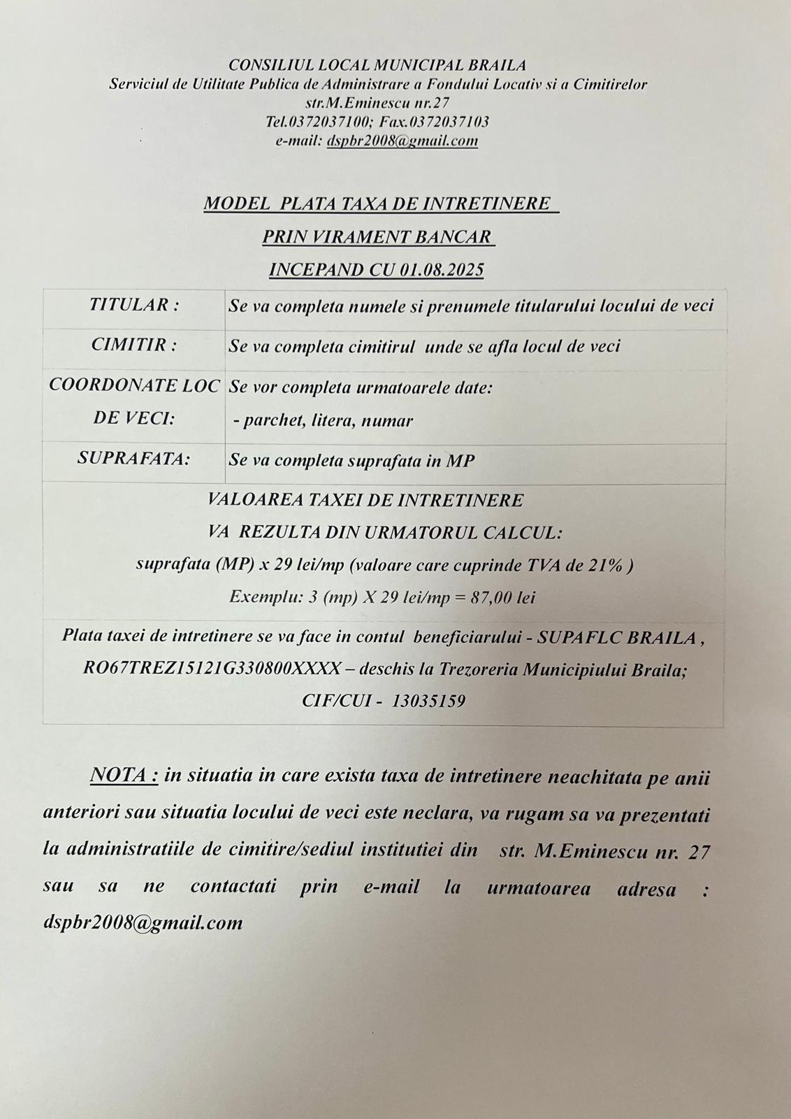 pot fi achitate prin viramente în conturile deschise de către S.U.P.A.F.L.C. la Trezoreria Municipiului Brăila.